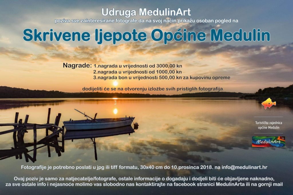 Udruga MedulinArt poziva sve zainteresirane fotografe da se prijave na fotonatječaj „Skrivene ljepote općine Medulin“. Fotografije je potrebno poslati u jpg ili tiff formatu, 30x40cm zaključno sa 10.12.2018. na – gdje možete postaviti eventualna dodatna pitanja ili nam se javiti na stranici MedulinArt na facebooku.